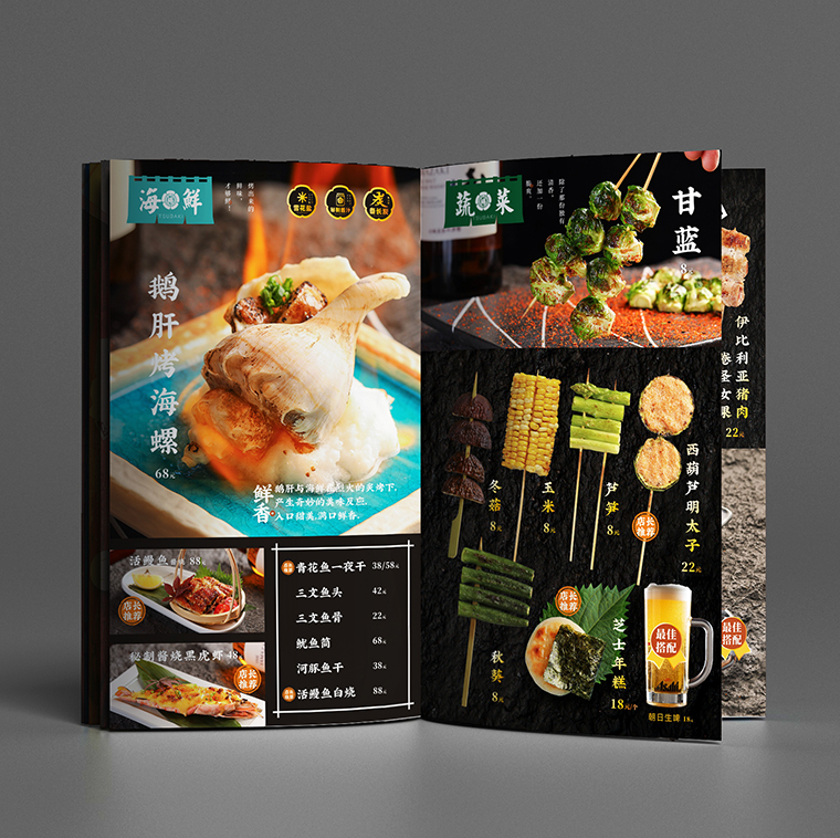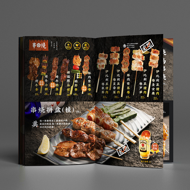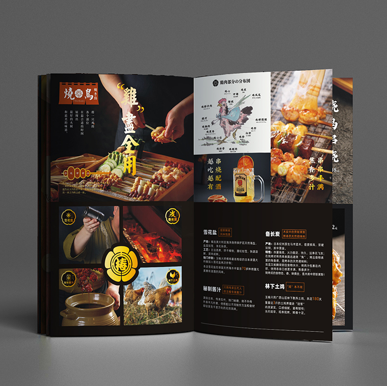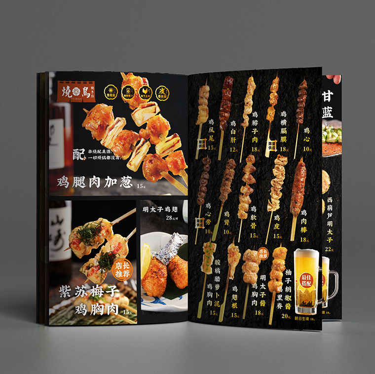 工作內(nèi)容:日本料理燒鳥居酒屋菜譜規(guī)劃,日本料理菜譜編排設計,日本料理燒鳥菜品文案話術(shù)撰寫,燒鳥料理居酒屋菜譜印刷裝訂。