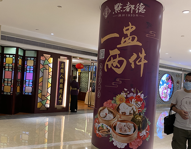空間中我們則用西關(guān)常見的騎樓、灰磚、鑊耳山墻、趟門,把百年傳承的文化韻味裝飾出來,讓消費(fèi)者身臨其境,感受蘩樓的西關(guān)點(diǎn)心文化。這是把