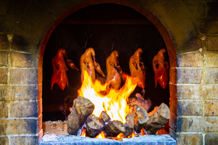 地道北京烤鴨,選用特別飼養的北京填鴨,經過獨特燒烤流程制作而成,口感細膩,入口即化,并且呈現閃著油光明亮的暗紅色。這種暗紅是北京主旋律為“丹韻”在飲食文化上的重要表現。地道的“北京烤鴨”始于明朝京城御膳房,當時就有“京師美肴,莫妙于鴨,炙者尤佳”歷史記載。