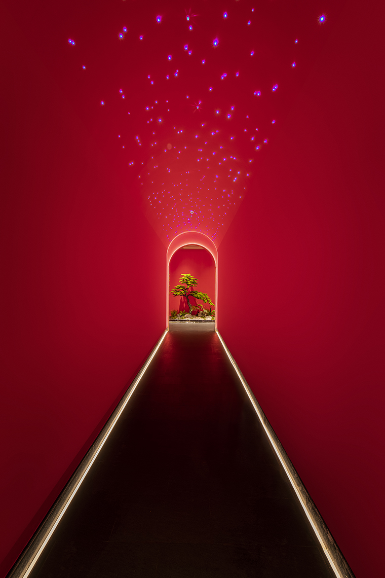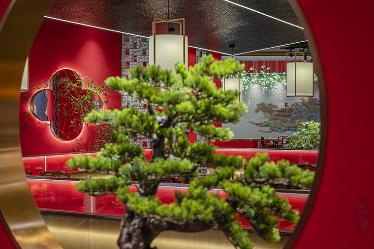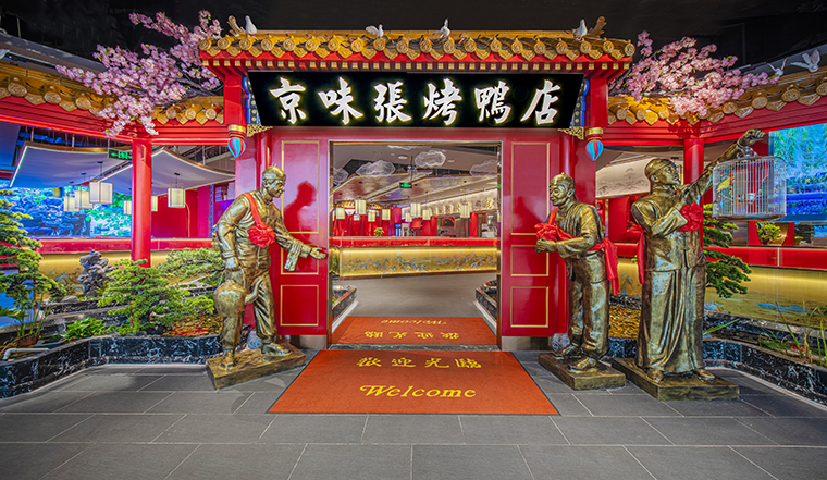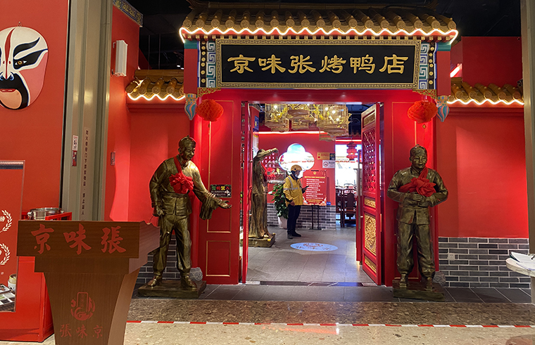 京味張的空間裝飾設計大量借鑒了中式園林造景手法,一步一小景、三步一大景,步移景異。用中國紅強化品牌內含的北京皇城文化,令人印象鮮明;門口的迎賓人,提籠遛鳥人,跑堂人等雕塑銅人將老北京烤鴨飲食文化自然帶出;中式園林造景手法,點綴綠植,水景,框景,步移景異;天花的不銹鋼波紋板,一朵朵的祥云裝飾;矮隔斷的千里江山中國山水工筆畫造型裝飾,仿佛流動的山水國畫;立面的水晶玻璃磚,暗藏燈帶的玻璃隔斷,空間中各種不銹鋼收邊條,明檔上的不銹鋼背發光字,現代裝飾材料與經典美食交相輝映,經典不失時尚。