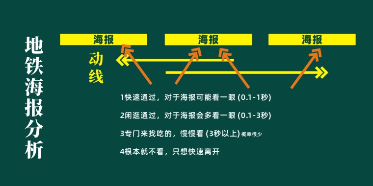 通過(guò)在地鐵站現(xiàn)場(chǎng)觀察,品深發(fā)現(xiàn)蘩樓的地鐵海報(bào)位置單面靠墻,閱讀動(dòng)線是沿著墻的路徑左右行走,目標(biāo)是向前方換乘或出站,由于客流密集,路過(guò)此處的人完全無(wú)法停下來(lái),看到海報(bào)的大部分的機(jī)會(huì)是眼睛的余光一掃而過(guò),邊走邊看。