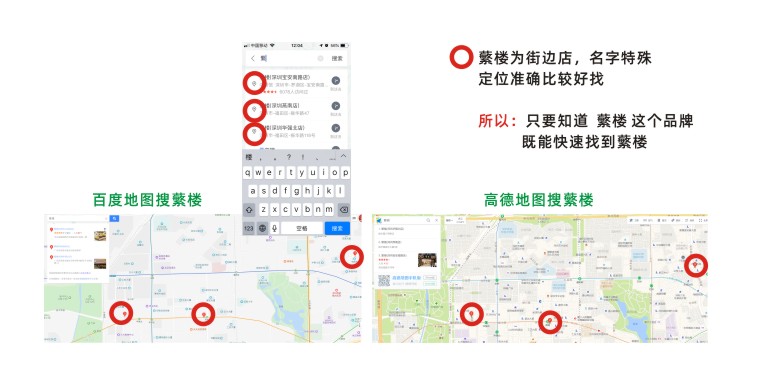 蘩樓”這個(gè)詞在搜索端屬于新詞,且由于都是臨街店鋪,只要在導(dǎo)航地圖上搜索“蘩樓”即可出現(xiàn)店面的準(zhǔn)確地址,因此在海報(bào)地址信息中只需要告訴顧客店址區(qū)域即可,如:“華強(qiáng)北店”顧客自動(dòng)腦補(bǔ)深圳華強(qiáng)北區(qū)域蘩樓,加上智能手機(jī)強(qiáng)大的導(dǎo)航功能,只需要搜索“蘩樓”選取“華強(qiáng)北”為主的關(guān)鍵詞即可知道離店的大概距離。
