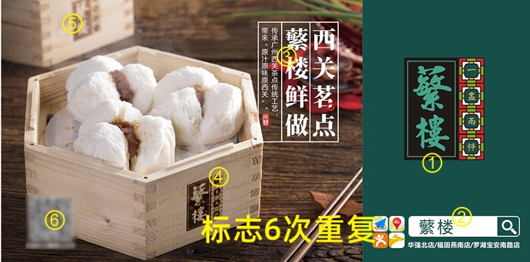 a 畫(huà)面重復(fù)三次以上出現(xiàn)“蘩樓”logo信息:由于顧客是路過(guò),而且離畫(huà)面很近,所以眼光掃射之處并不是全部看見(jiàn)海報(bào)的,而是海報(bào)的某一個(gè)角落或一個(gè)點(diǎn)一個(gè)面的形式組合。因此畫(huà)面中我們從廣告語(yǔ)“西關(guān)茗點(diǎn),蘩樓鮮做”+蘩樓logo+搜索框“蘩樓”+蒸籠上“蘩樓”,在一個(gè)畫(huà)面中多次刻意出現(xiàn)蘩樓品牌logo。