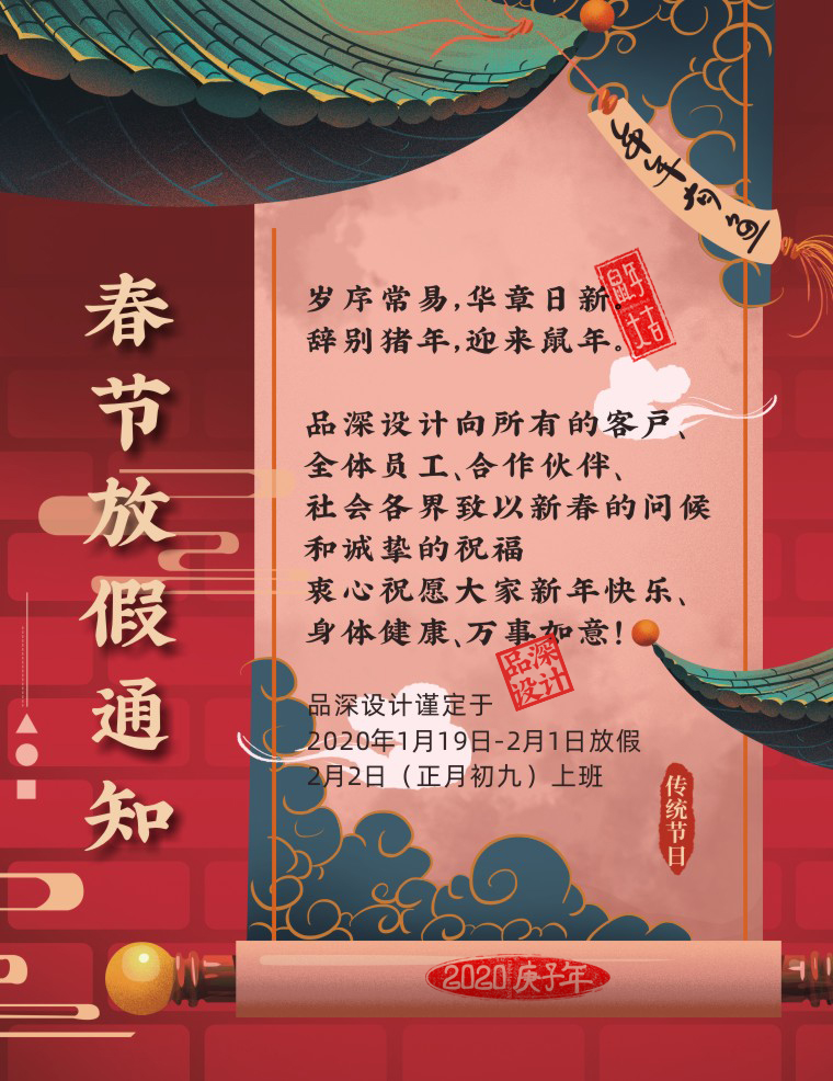 品深設計謹定于2020年1月19日(臘月25)正式放假,2月2日(正月初九)上班。