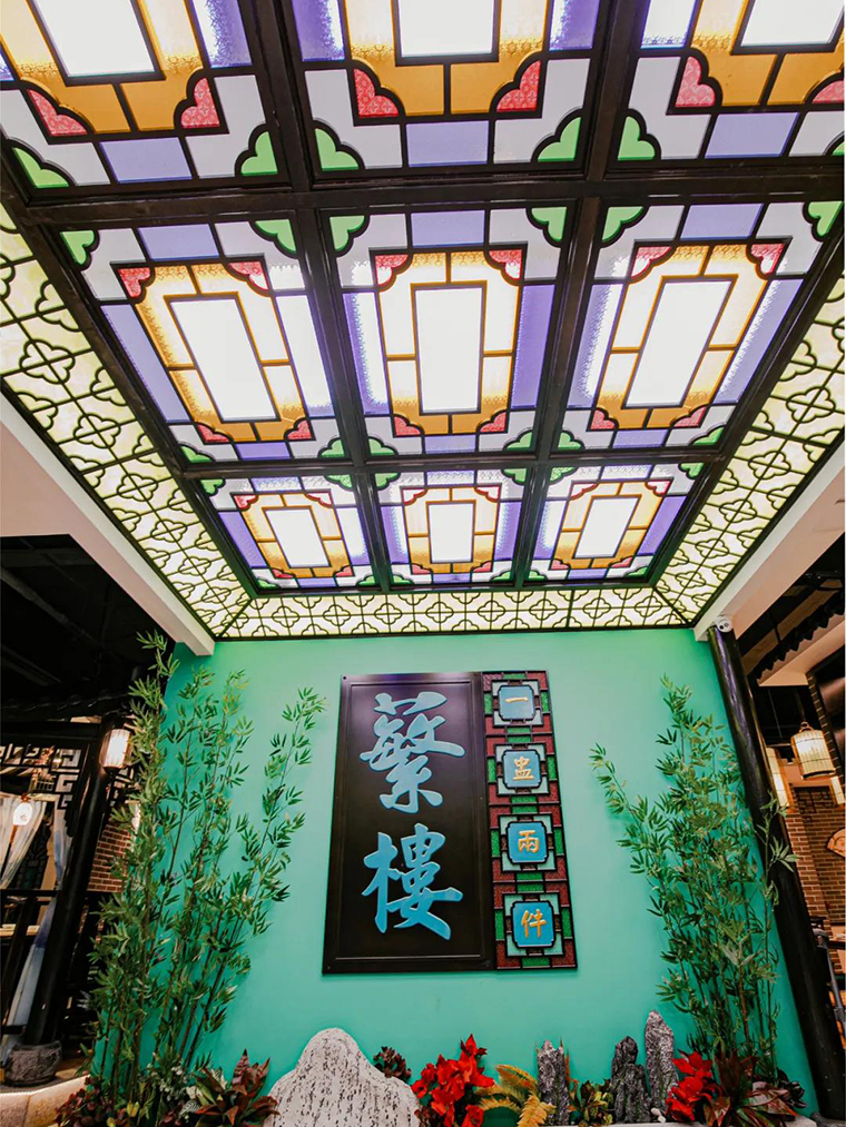 ,通過“紅配綠,大紅配大綠”這種大膽的色彩運用,將“得閑飲茶”的廣式休閑飲食生活文化營造的非常鮮明,時尚又極富歷史厚重感,深受廣大顧客的喜愛,為門店創造了持續穩定的客流。