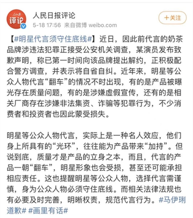 隨后“茶芝蘭”明星代言人,馬XX工作室就發布了解約和致歉聲明,馬XX也轉發微博表示“積極配合調查、自省自糾、更為嚴謹”。