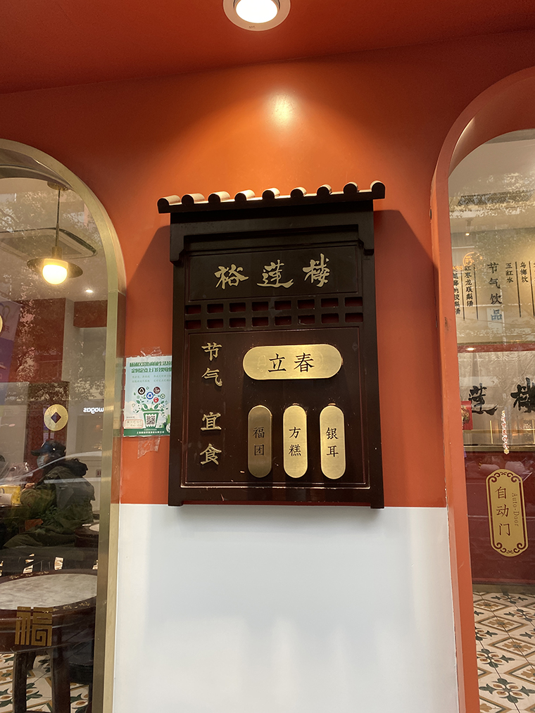 在空間布局上,我們把窗口設為開放式明檔,營業時打開狀態,展現我們的制作工藝;晚上關閉時,中式簡約經典窗格,金色閃閃,體現品牌悠久歷史。