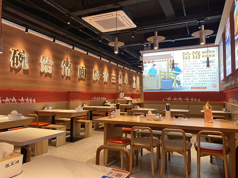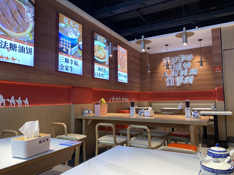 4、品深設計認為,面館本質上與簡餐是一樣的,顧客就是在簡餐和面館之間切換口味而已,所以我們在門店內部沒有過多展示品牌的文化。更多是推廣品牌、推廣產品,圖文并茂直接講清楚,饸饹面是一種什么面食?錢三順是怎么來的?錢三順的核心賣點是什么?我們主推哪些產品等等。