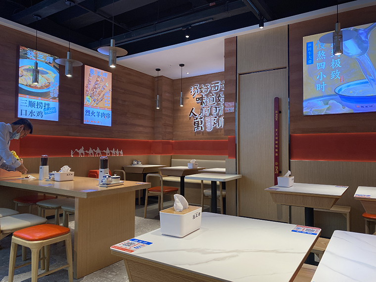 1、整個空間圍繞饸饹面是西北的小吃,在墻面的裝飾材料上用了能代表西北地貌特色的黃土高原涂料,顏色暖黃極像黃土。進入門店,仿佛置身于大西北的某個面館,讓顧客產生了品牌的認同。